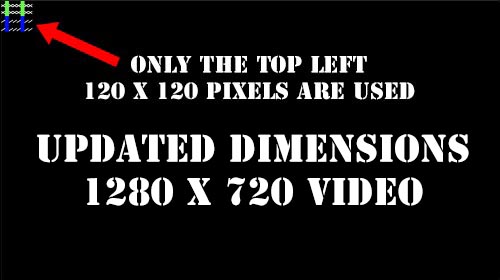 For performances at Jam sessins, prepackaged video should be made on a blank black 1280 x 720 video with just the content in the upper left corner. The system will grab just those 120 x 120 pixels and send them to the Video Frames. Similarly if you want to do a live VJ set or generative video live, you will set your laptop to 1280 x 720 resolution and stick your content in the upper left corner. A USB video capture card will send the full screen to the media server laptop and it will grab just those 120 x 120 pixels. If you can give files in advance, then just 120x120 pixels is best. Or just give me two HD ratio video files and I'll convert them to one 120x120 file.