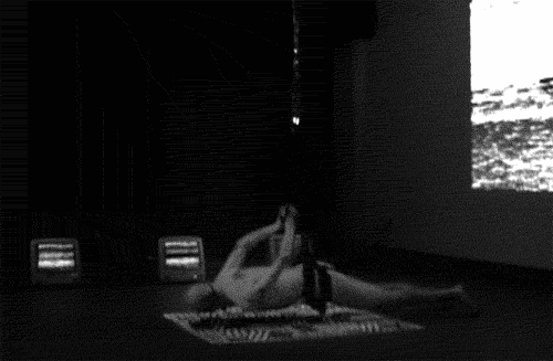 is situated in an environment of moving images. He is