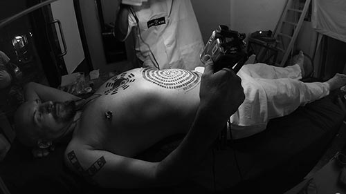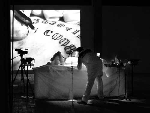 | The artist recorded his tattooing with a macro camera and broadcast this extreme close up video of each numeral as it appears in his flesh, to a large screen nearby. Onlookers were able to watch the tattooing or choose to watch the screen with a very intimate level of detail. They saw the numbers draw blood and irritate the flesh; watched the realization of this spiral out from the navel, the original source of life and caregiving and the birthplace of identity (severing of the umbilical cord produces separation and is the birth of identity). |